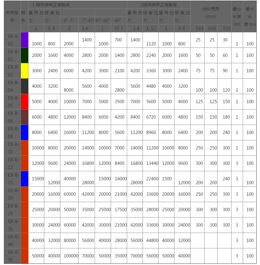 7、使用國際標(biāo)準(zhǔn)色來區(qū)分承載噸位。即使吊帶磨損也易于辨認(rèn)。